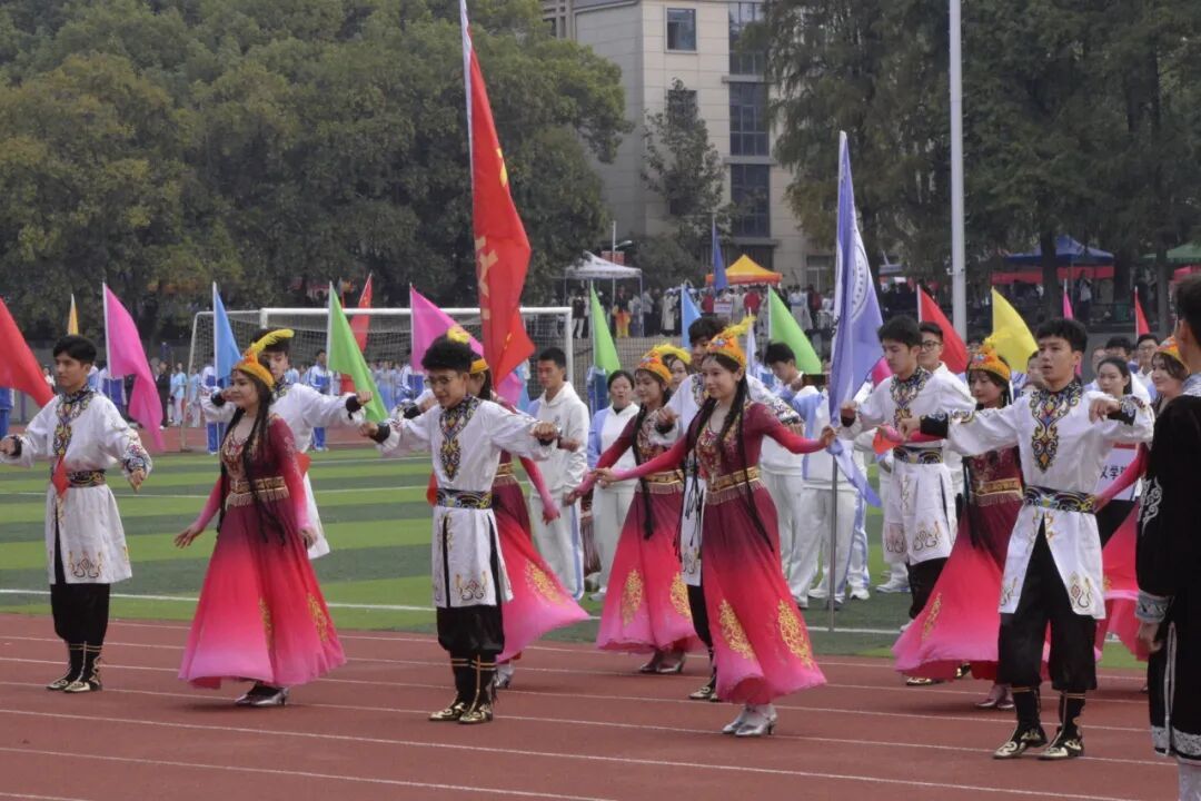 开幕式上,机电学院方阵以铿锵步伐和整齐队列惊艳全场。随后,少数民族同学献上舞蹈《石榴花开,同心共舞》,以绚丽的舞姿展现了机电学院多元融合、团结奋进的文化氛围,诠释了各民族学子像石榴籽一样紧紧抱在一起的深厚情谊。
